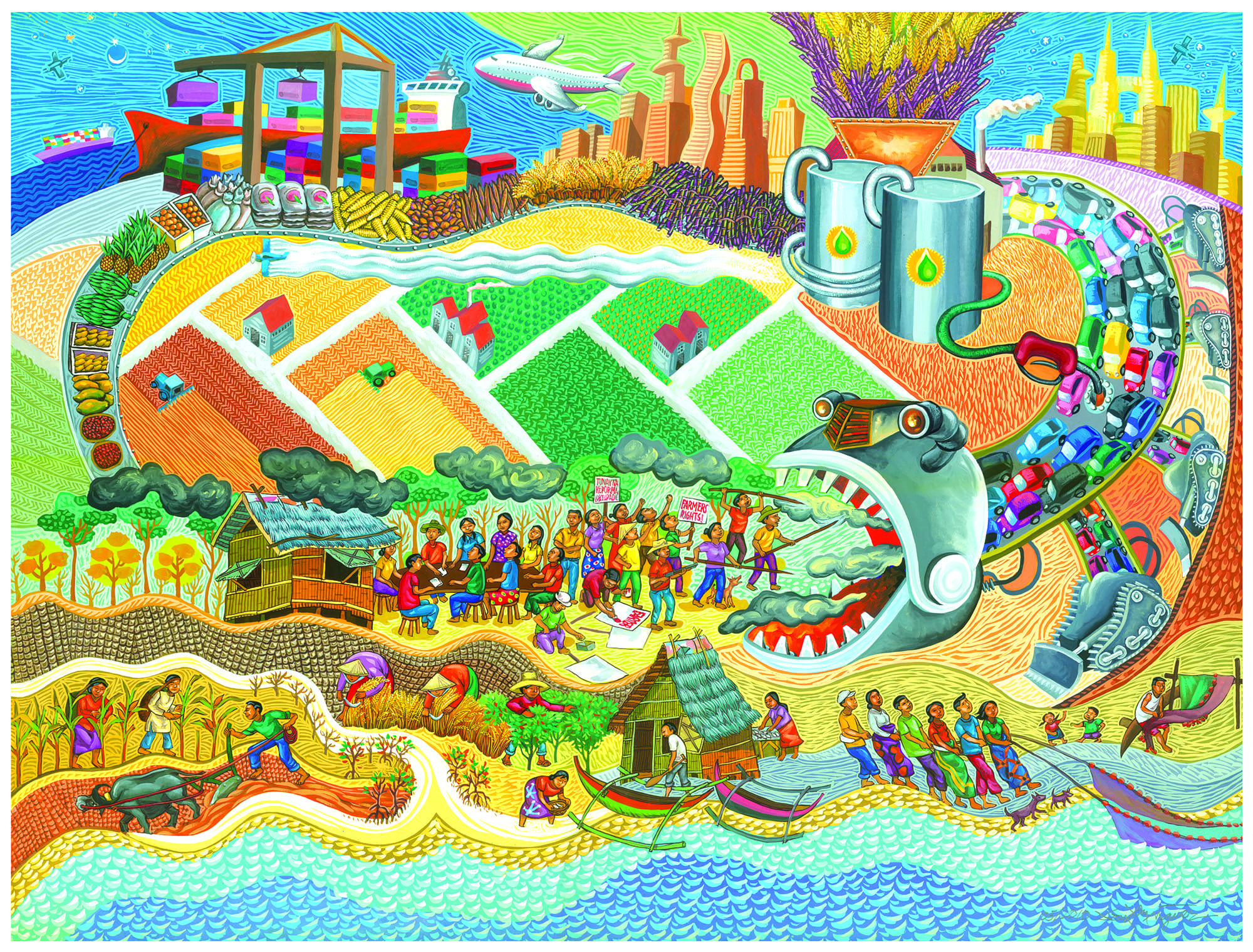Over the years, JPS has worked with Filipino activist artist Federico ‘Boy’ Dominguez on journal cover and poster images. We are making all these images available in this gallery. Anyone can use an image by Boy Dominguez as long as the artist is acknowledged as well as JPS. You may also want to give a token honorarium for the use of images directly to Boy Dominguez, although this is not obligatory. We also use other artwork on thie site, including a painting by James C. Scott, and photography from Melgarejo, Celeirio de Memoria, Jacobo Grajales, and David Meek